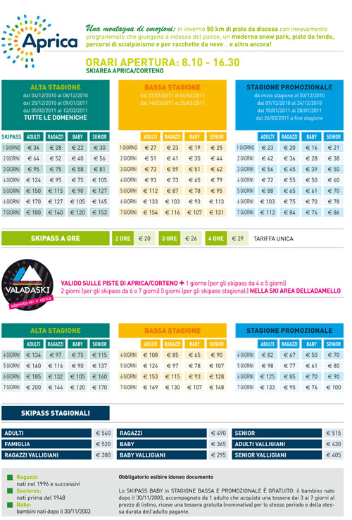 TARIFFE SKIPASS APRICA-CORTENO 2010-2011