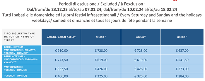Skipass Stagionale Feriale Cervinia Valtournenche 2024/2025