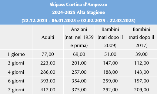 Skipass Alta Stagione Cortina dAmpezzo 2024/2025