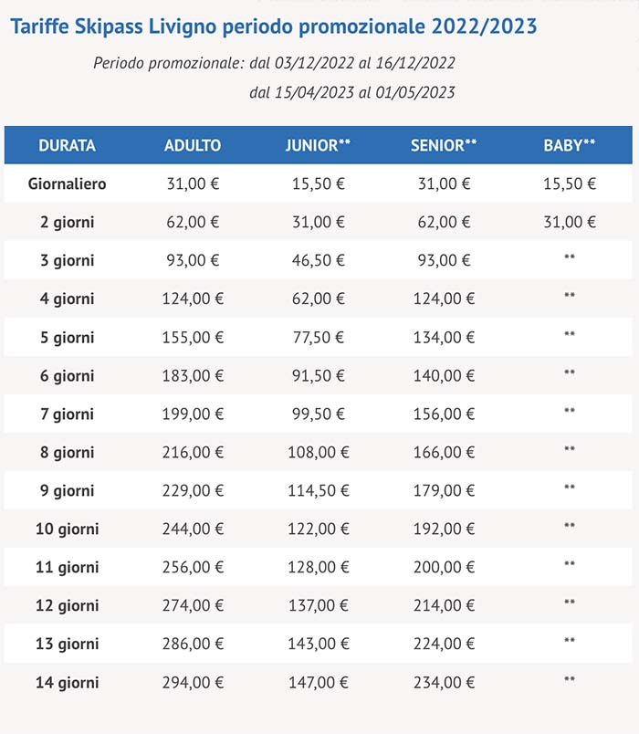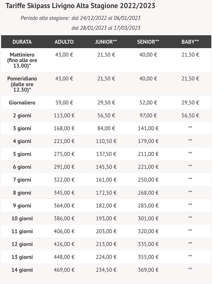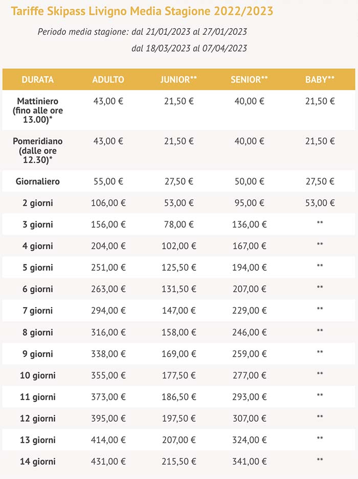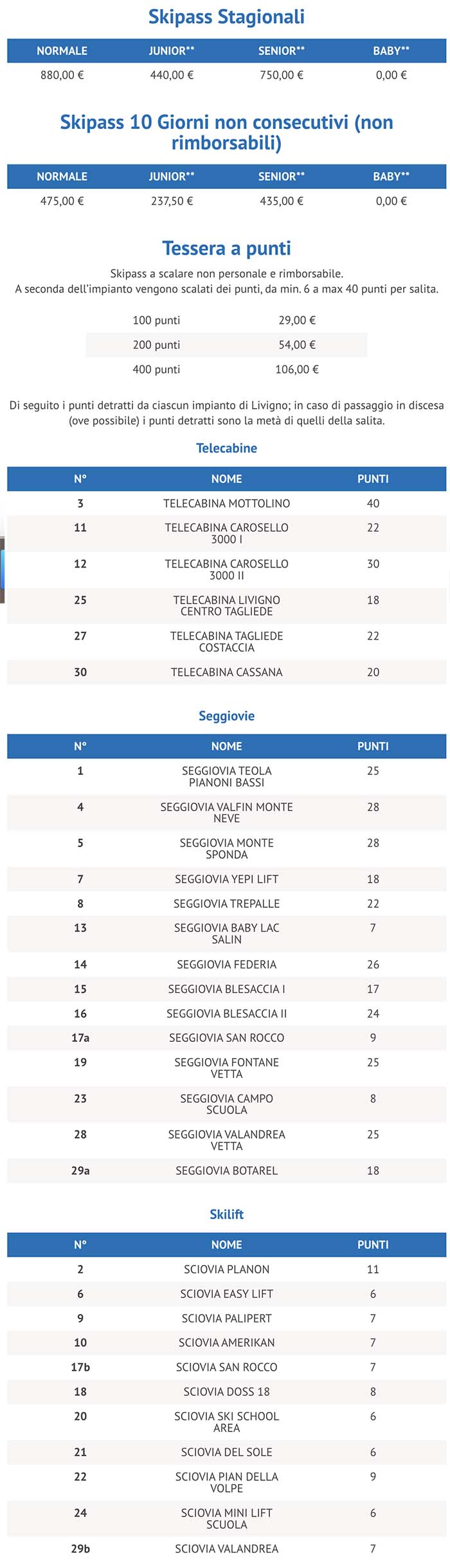 Tariffe Skipass a punti e Stagionali Livigno 2022/2023