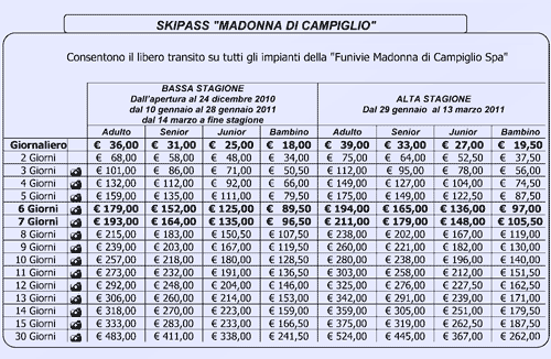 Tariffe skipass impianti Madonna di Campiglio 2010/2011