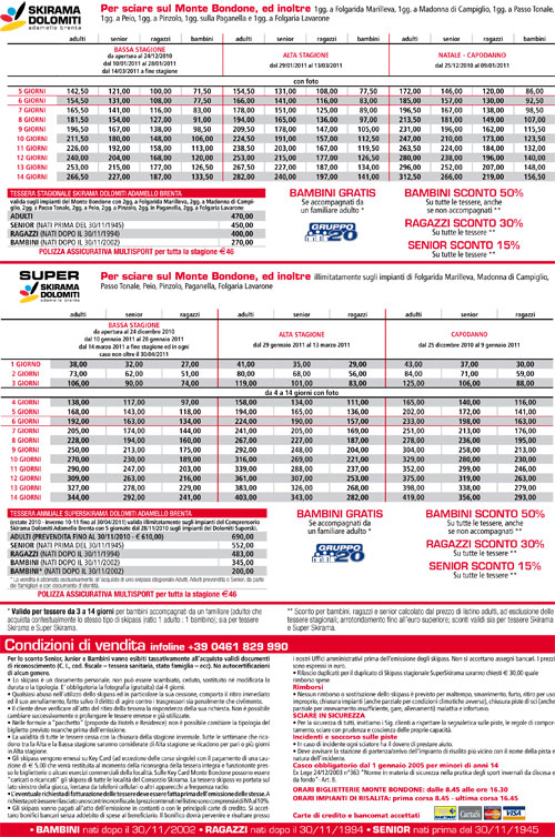TARIFFE SKIPASS MONTE BONDONE 2010/2011