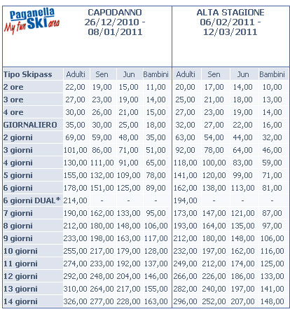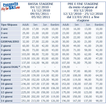 PREZZI SKIPASS PAGANELLA 2010-2011