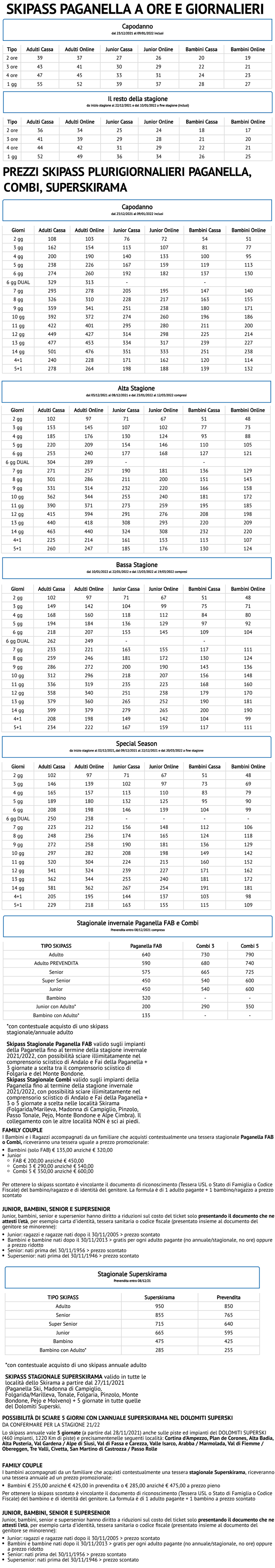 Prezzi Skipass