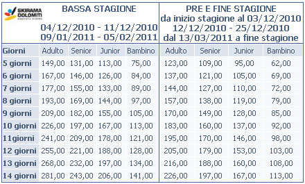 PREZZI SKIPASS SKIRAMA 2010-2011