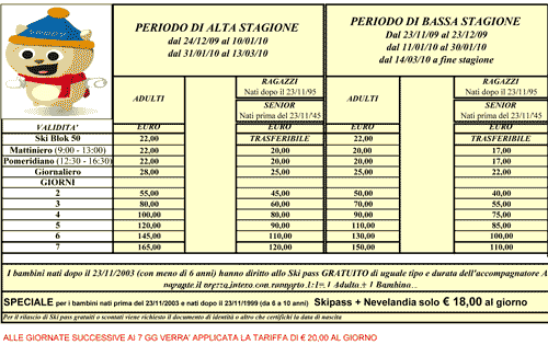 TARIFFE SKIPASS SAPPADA 2009-2010