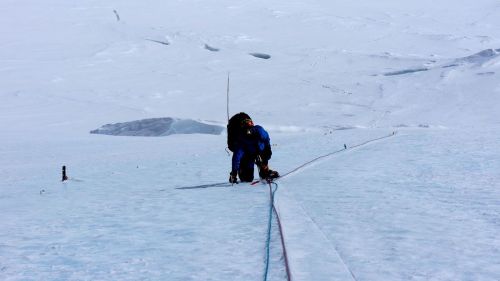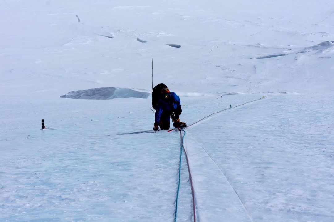 I primi tre giorni il tempo è clemente e si sale relativamente poco. Le slitte si portano con facilità. Ai campi i ragazzi della spedizione prendono confidenza con la costruzione di cucine in ghiaccio. Si tagliano con la sega grossi mattoni di ghiaccio e via a fare muretti, ripiani e ripari esattamente come gli eschimesi fanno con gli igloo.