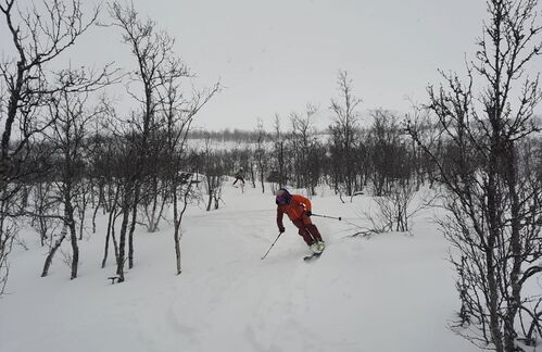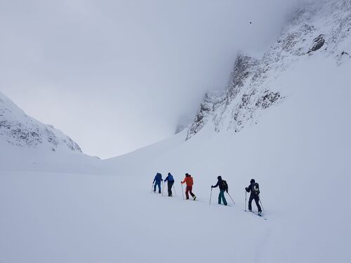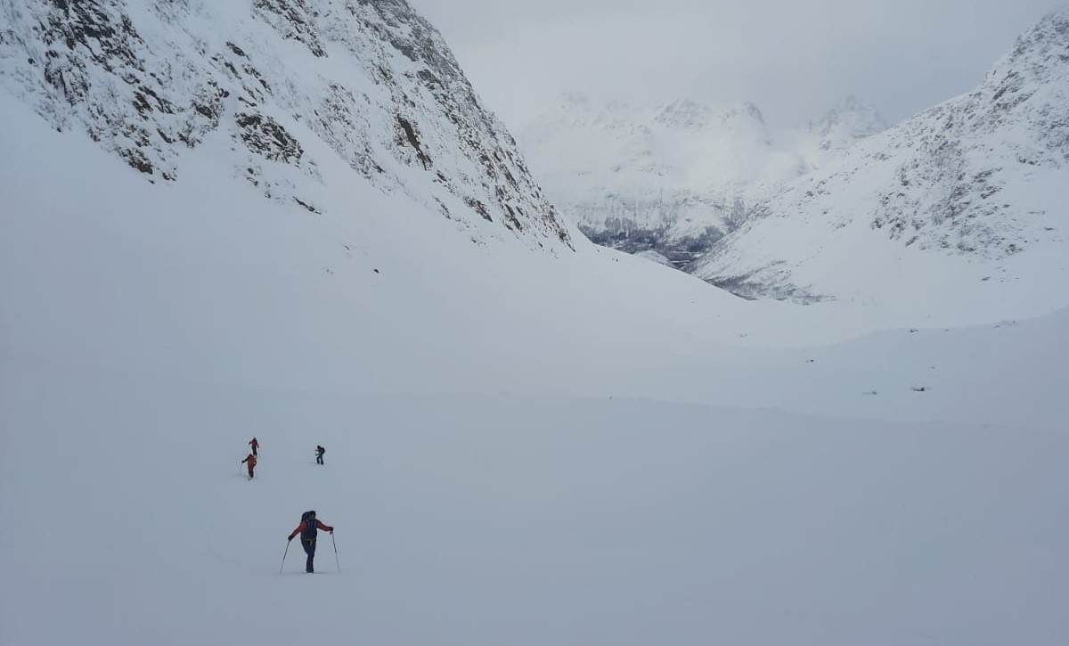 Qui nevica ogni sera. Questa mattina fa freddo, il cielo è coperto con nubi alte. La Norvegia ha trovato il modo di conservarci la farina ogni giorno. Dopo un’iniziale esitazione si decide per una gita con lungo sviluppo vicino a casa. Partiti dal mare ci inoltriamo in un lungo vallone verso l’entroterra. L’ambiente è molto diverso, da definire quasi “alpino”, suggestivo e chiuso da pareti rocciose. Proseguiamo per 958m e poi ancora la nebbia ci costringe a spellare e scendere. Sentiamo comunque il velluto sotto i nostri sci. Nel frattempo riprende a nevicare ma non ancora soddisfatti raggiungiamo, percorrendo altri 850m di dislivello, il colle Tyndall. Iniziamo tutti a sentire un po’ di stanchezza, ma ci godiamo comunque una splendida discesa zigzagando con disinvoltura tra roccette, motte e alberelli. La discesa termina dritti dritti sulla spiaggia!