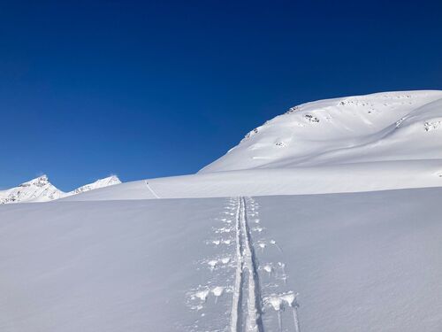 Questa mattina ci svegliamo con il cielo terso. La temperatura è sempre sotto zero ma il paesaggio è molto diverso sotto i raggi di sole, si infittisce di contrasti. Le strade sono ancora totalmente bianche. Guardiamo con piacere una bella bimbetta con le trecce bionde che corre lungo la strada. La gita mattutina è spettacolare. Iniziamo risalendo un bosco per poi portarci su ampissimi pendii bianchi e poi su una cresta. Raggiungiamo la cima Blatinden (1180m). Vista mozzafiato a 360 gradi: da un lato il mare stretto nel fiordo, dall’altra la catena delle Lyngen Alps, ricca di cime aguzze e straripanti di neve. Il canalone di discesa sembra farci da trampolino verso il mare.