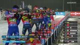 Nella frazione di lancio il francese Fabien Claude (0+0) vince la sfida con il norvegese Sturla Holm Laegreid (0+0) infliggendogli 10 secondi di distacco nell'ultimo giro. Al primo cambio si presenta in terza posizione a 26 secondi lo svizzero Stalder (0+1) che precede lo sloveno Dovzan (0+1) e lo statunitense Campbell Wright (0+1), quinto a 40 secondi. E' in difficoltà il tedesco Zobel (0+0) a 41 secondi dopo essere uscito dall'ultimo poligono a soli 13 secondi dai primi due; cede nel terzo giro dove perde 30 secondi anche Elia Zeni (0+1) che arriva al cambio a 56 secondi da Claude in tredicesima posizione.