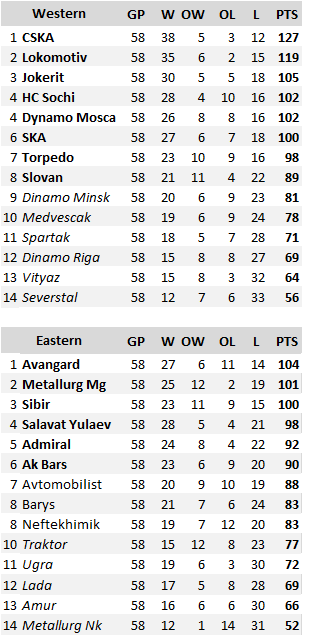 A Ovest i giochi sono fatti e si conoscono i nomi delle otto squadre che passano ai playoff dove l'ultima casella è stata riempita poco prima della sosta dallo Slovan Bratislava che ritorna dopo 3 anni a disputare una partita di post-season. Con CSKA e Lokomotiv certe delle loro posizioni e lo Jokerit, d'ufficio alla casella 2, come prima classificata della Bobrov Division, le ultime due giornate sono destinate a dare il volto finale alla classifica dal quarto al settimo posto con relativa definizione del tabellone dei playoff. Al momento Sochi e Dynamo Mosca hanno un vantaggio sulle altre nella lotta per la quarta posizione: i Leopardi della città olimpica affronteranno due squadre che nulla hanno più da chiedere come lo Slovan Bratislava e il Medvescak Zagabria mentre gli elettricisti moscoviti andranno in trasferta prima a Riga e poi nella tana del CSKA. Potrebbero approfittare di un passo falso delle due squadre a quota 102 punti, i campioni in carica dello SKA San Pietroburgo (100 per loro) che affrontano oggi lo Jokerit a Helsinki e giovedì, sempre in trasferta, la Dinamo Riga. Da più in basso, a quota 98, guarda con interesse l'evolversi della situazione la Torpedo di Nizhny Novgorod (Severstal in casa e Dinamo Minsk in trasferta i suoi impegni).