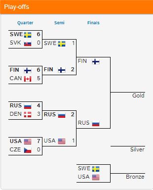 Nella prima semifinale la Svezia, arrivata a questo punto del cammino senza una sconfitta, è riuscita a ridurre l'impatto delle bocche da fuoco finlandesi con la sua solida difesa ma non è stato sufficiente. In una strana atmosfera con le tribune del palazzo del ghiaccio colme di delusi canadesi l'incontro ha faticato a decollare; solo a metà del primo periodo una discesa di Timashov coglie di sopresa la difesa dei padroni di casa, Asplund raccoglie il disco e supera Kahkonen dando alla Svezia un illusorio vantaggio. Nel secondo periodo, bloccata la linea Laine, Aho, Puljujarvi è Roope Hintz a pareggiare i conti (31:08). Due minuti più tardi in power play Rantanen da dietro la porta serve Kalapudas che scarica in rete il goal della vittoria. La Svezia nonostante abbia ancora tempo a disposizione non riesce a reagire e per la Finlandia si aprono le porte della finale.