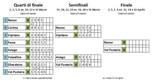 Non hanno riservato sorprese i primi due turni dei playoff e domani sera, a Collalbo, andà in scena gara 1 di una finale ampiamente prevedibile. Da una parte i padroni di casa della Rittner Buam, primi nella stagione regolare e capaci di mettere in fila otto vittorie senza sconfitte eliminando prima il Cortina e poi il Vipiteno in una serie di semifinale dove l'unica gara in bilico è stata la quarta chiusa all'overtime dopo tre secche vittorie che avevano aperto le porte dell'ultimo atto al Renon a caccia del secondo scudetto dopo quello del 2014.