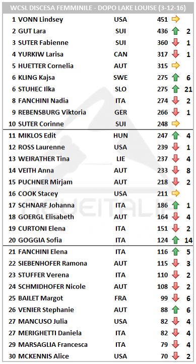 A beneficiarne in particolar modo è il podio di gara 1 che esce dal doppio impegno con ricche promozioni: la slovena Stuhec, grazie alle due vittorie, risale 21 posizioni e si issa nel primo gruppo di merito, quello delle 10 atleti che possono scegliere il pettorale dispari tra l'1 e il 19. Stessa sorte, con 6 posti guadagnati, per la svedese Kajsa Kling.