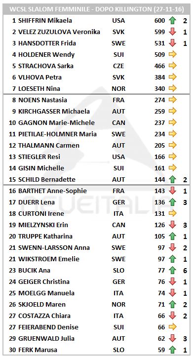 A farle posto è la francese Anne-Sophie Bartet alla quale il ventiduesimo posto di Levi e il ventiseiesimo in Vermont non sono stati sufficienti a mantenere la posizione tra le top 15. Nel secondo gruppo dove la slovena Ana Bucik guadagna 6 posizioni, sino alla ventitreesima, fa l'ingresso la sua connazionale Marusa Ferk che strappa il trentesimo posto alla svizzera Chable.