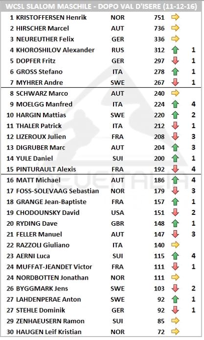 L'unica variazione di rilievo della settimana è l'ingresso di Marc Digruber - l'austriaco ha chiuso al quarto posto lo Slalom di domenica - nel primo gruppo di merito dal quale ha scalzato il norvegese Sebastian Foss-Solevaag mentre compie un gran balzo in avanti e sarà nei 15 a Madonna di Campiglio (sempre per l'assenza di Dopfer) la rivelazione di questo scorcio di stagione, Michael Matt.