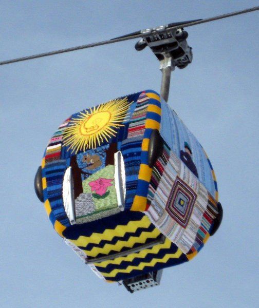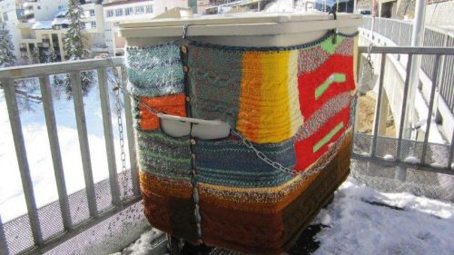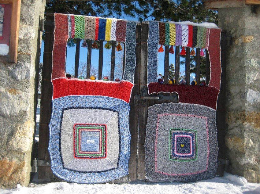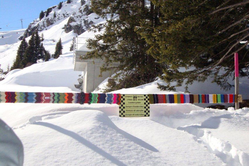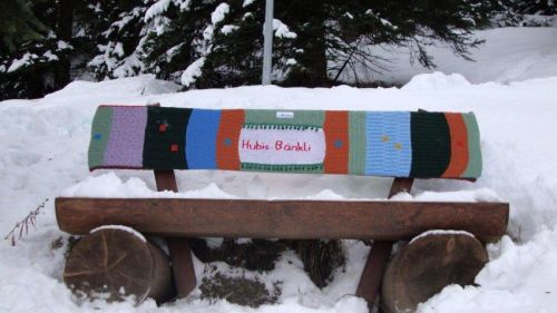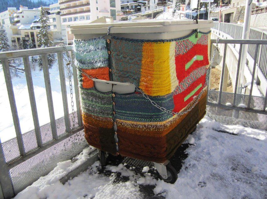 Arosa era un mare colorato di maglia questo inverno: panchine, ringhiere, cartelli, cancelli, tapparelle, bottiglie, lampade, persino una cabinovia completa degli impianti sciistici. Qualsiasi oggetto nel villaggio di montagna svizzero ha avuto durante i mesi freddi un vestito di lana caldo.