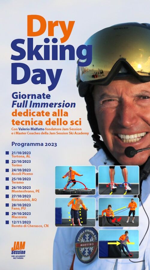 Durante il “Dry Skiing Day” Valerio Malfatto, fondatore di Jam Session, e i Master Coaches della Jam Session Ski Academy vi sveleranno le cose veramente importanti della tecnica moderna dello sci con analisi video, spiegazioni alla lavagna e con la correzione degli errori più comuni e radicati. Imparerete molti esercizi fondamentali da fare a casa o in ufficio e acquisirete piena consapevolezza del gesto tecnico. Il metodo della Jam Session Ski Academy è il primo e l'unico che integra in modo ottimale l'insegnamento sulla neve con una serie di esercizi tecnici a secco, frutto di una grande esperienza di insegnamento e di una continua sperimentazione didattica nel campo della propriocezione. Andare alla radice del gesto tecnico, capirlo profondamente e impararlo nei suoi aspetti più essenziali è un passo importantissimo per imparare veramente e creare le premesse per effettivi miglioramenti. Assolutamente importante per gli sciatori avanzati ed esperti per capire la sciata in conduzione, è un fantastico acceleratore di apprendimento anche per principianti e sciatori di livello medio. Il "Dry Skiing Day" non mira quindi ad insegnare esercizi per la preparazione fisico-atletica, ma si focalizza sull'apprendimento del gesto vero e proprio come non sarebbe possibile fare direttamente sulla neve.Imparare “a secco”il gesto tecnico vuol dire aprire nuove vie per imparare in modo semplice e naturale, per sbloccare meccanismi incompresi o "inceppati" e ottenere progressi tecnici effettivi e duraturi.
