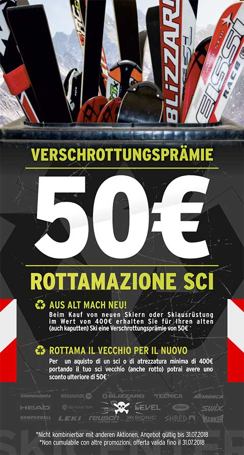 Ultima delle offerte da non perdere, lanciata proprio in questi giorni, consente a tutti di ottenere 50 Euro di sconto aggiuntivi rispetto alle offerte, portando un vecchio paia di sci, anche se inutilizzabili!