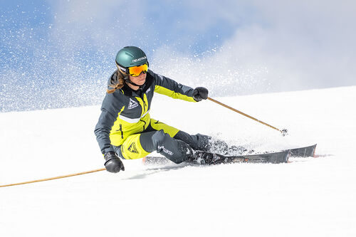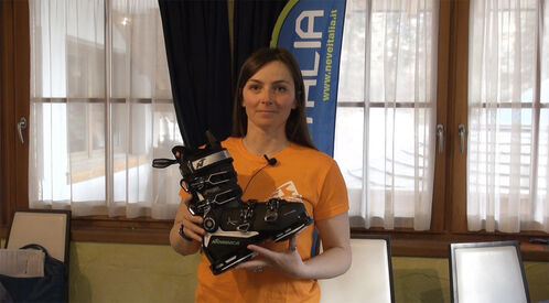 TEST IN PISTA, Poncet lo consiglia a sciatrici che amano sciare tutto il giorno grazie alla calzata molto comoda, i ganci sono molto intuitivi. La suola rende facile la camminata su ogni tipo di neve. Non lo consiglia a chi ama sciare ad alte velocità a causa del flex morbido che non assicura il massimo controllo.