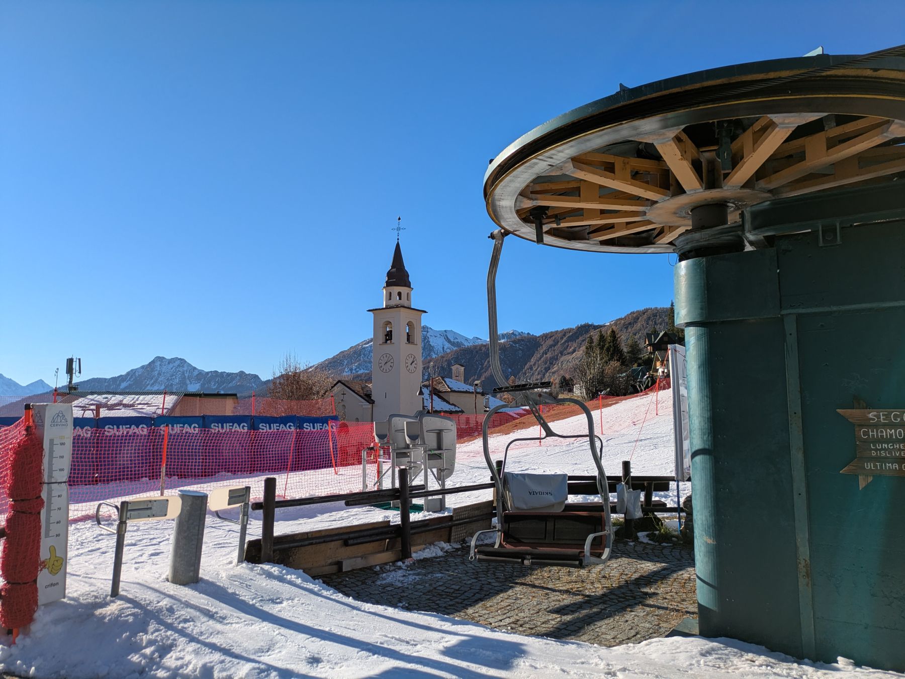 La stazione a monte della funivia è situata nella piazza principale di Chamois dove si trova la Chiesa Parrocchiale di San Pantaleone e il punto di accesso alle piste da sci.